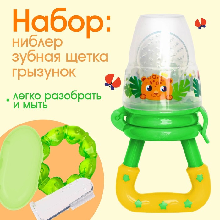 Набор M&B «Леопард»: ниблер для прикорма с силиконовой сеточкой, силиконовая зубная щетка на палец в контейнере, силиконовый прорезыватель
