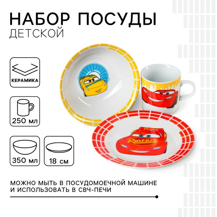 Подарочный набор посуды керамической, 3 предмета: тарелка Ø 16,5 см, миска Ø 14 см, кружка 200 мл, Тачки