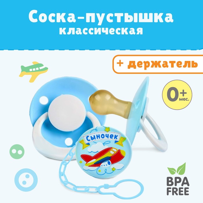Соска - пустышка латексная классическая «Сыночек», от 0 мес., с держателем, цвет голубой