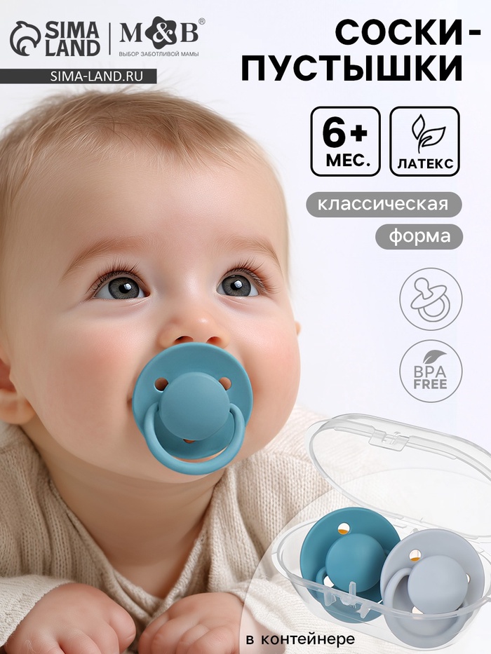 Соски-пустышки, от 0 мес., латекс, классические, в контейнере, набор из 2 шт., серо-синий/серый, M&B