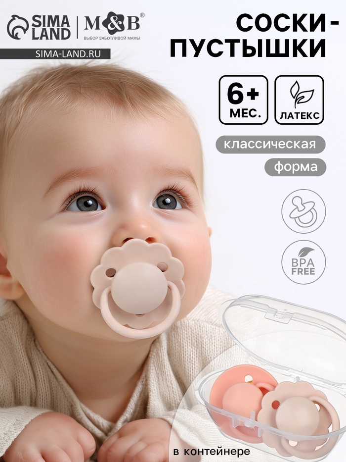 Соски-пустышки, от 0 мес., латекс, классические, в контейнере, набор из 2 шт., персиковый/айвори, M&B