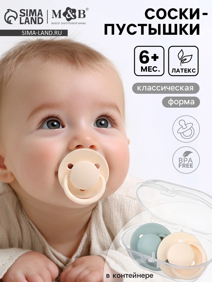 Соски-пустышки, от 0 мес., латекс, классические, в контейнере, набор из 2 шт., айвори/серо-зелёный, M&B