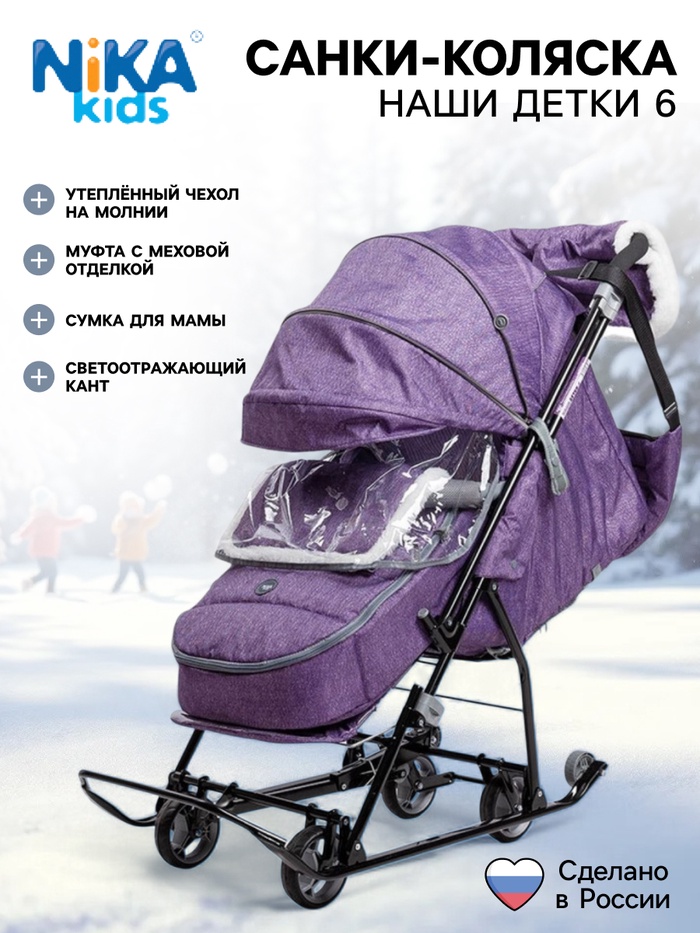 Санки - коляска «Наши детки 6», чехол для ног, муфта, сумка, баклажановый с полосками