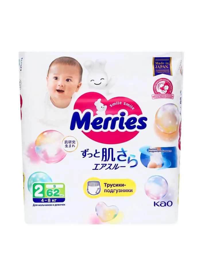 Подгузники-трусики Merries S 4-8 кг, 62 шт.