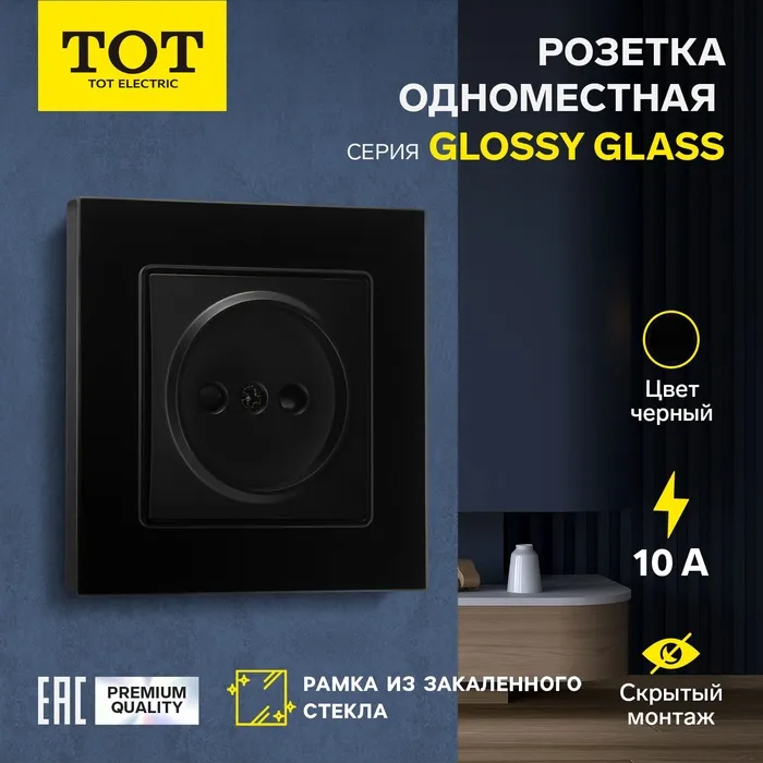 Розетка одноместная TOT Glossy Glass, 10 А, скрытая, без з/к, стекло, черная