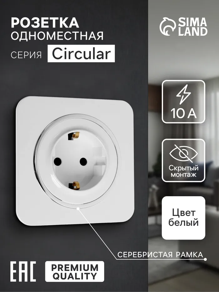 Розетка одноместная, серия Circular, 16 А, скрытый монтаж, с заземлением, серебристая рамка, белая
