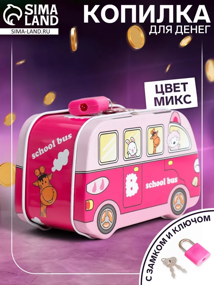 Копилка для денег с замком и ключом «Звери в автобусе», металл, 11×5.5×6.7 см, МИКС