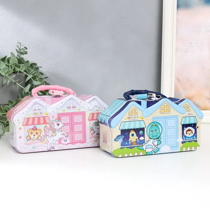 Копилка для денег с замком и ключом «Домик с жителями», металл, 19×6.5×9.5 см, МИКС