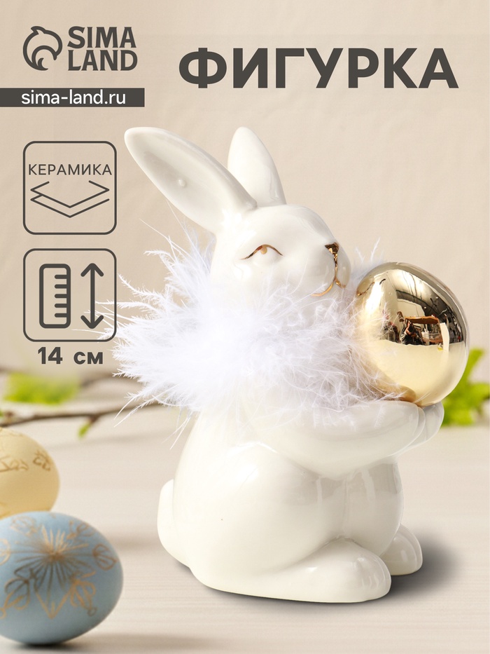 Фигурка «Зайка с золотым пасхальным яичком», керамика, пух, белый 8×10.5×14 см