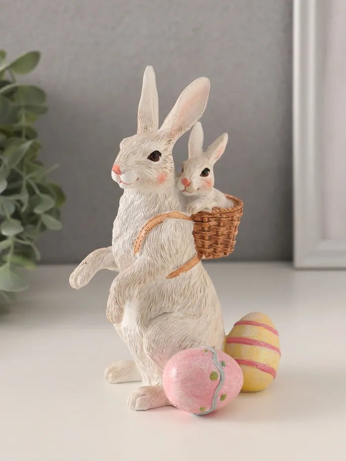 Фигурка полистоун «Кролик с крольчонком в корзине, с крашенными яйцами», 10×8.5×15.5 см