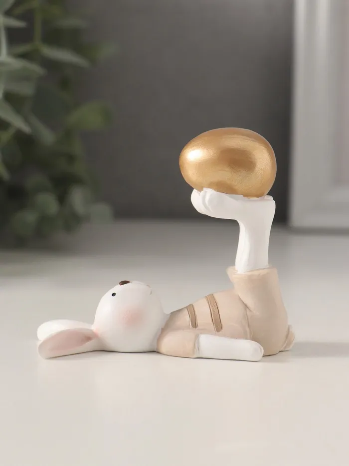Фигурка «Белый зайчик в бежевом наряде, с золотым яичком», полистоун, 8×4.5×7 см