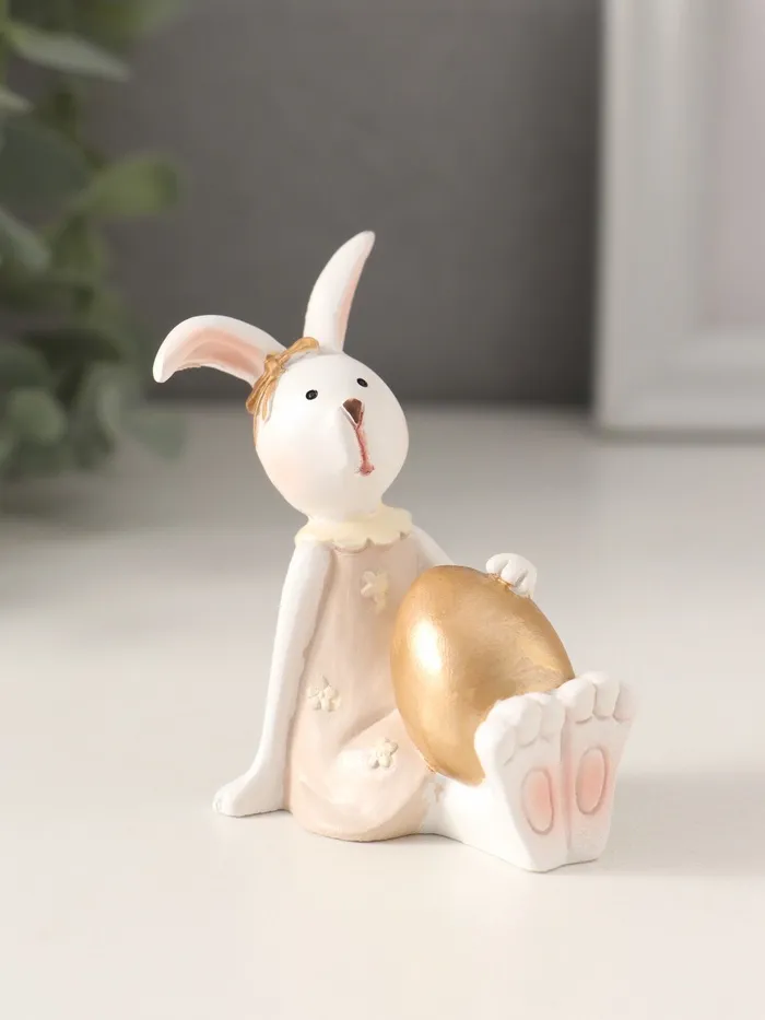Фигурка «Белый зайчик в бежевом наряде, с золотым яичком», полистоун, 8×4.5×7 см