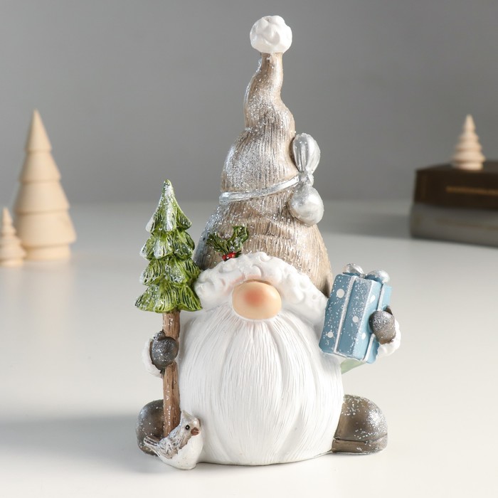 Фигурка полистоун «Дед Мороз в колпаке с бантиком, с ёлочкой и подарком», 7.5×11×19 см