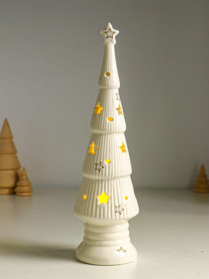 Фигурка светящаяся «Ёлочка со звёздами», керамика, белый с золотом, 7×7×24 см