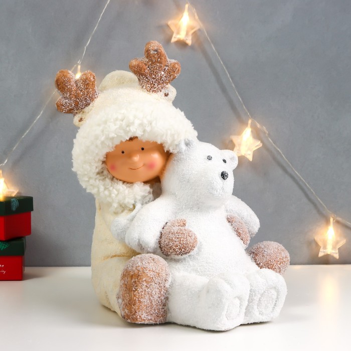 Фигурка керамика «Малышка в шубке и с рожками на капюшоне, с мишкой», 37×31×26 см