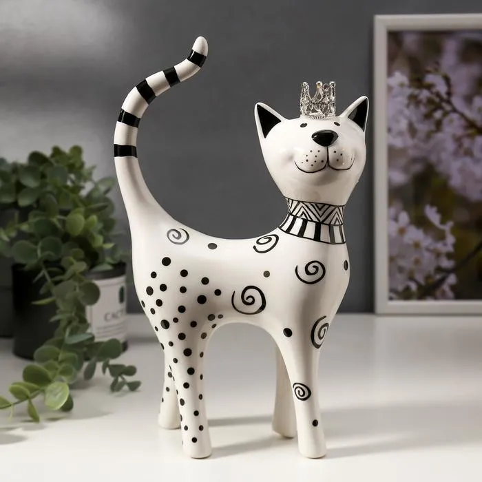 Фигурка керамика «Кошечка в короне, узорная», бело-чёрная с золотом, 23.5×6.5×14.5 см