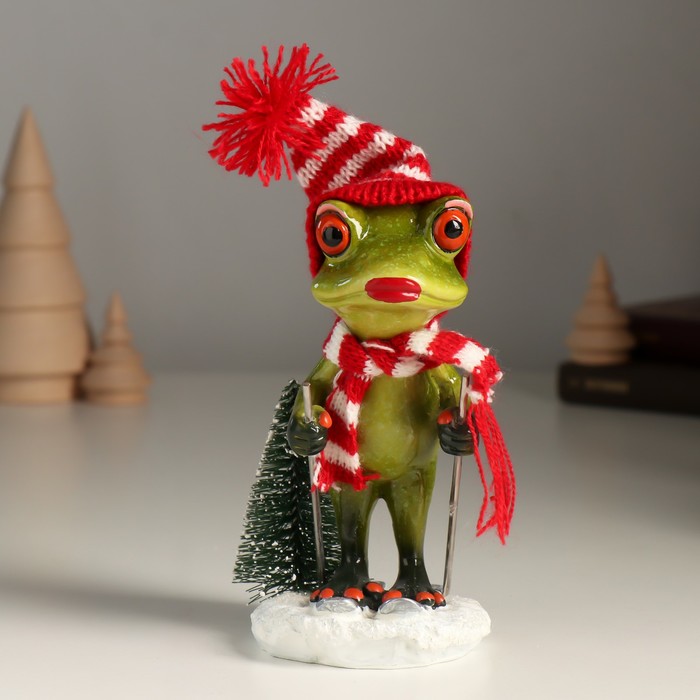 Фигурка полистоун лак «Лягуха в шапочке и шарфике на лыжах», 8.5×7×14 см