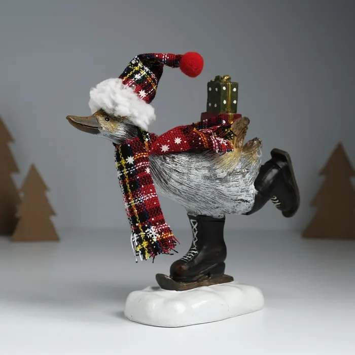 Фигурка полистоун «Гусь в колпаке, вязаном шарфе, на мини-лыжах, с подарками», 6.5×19.5×17 см