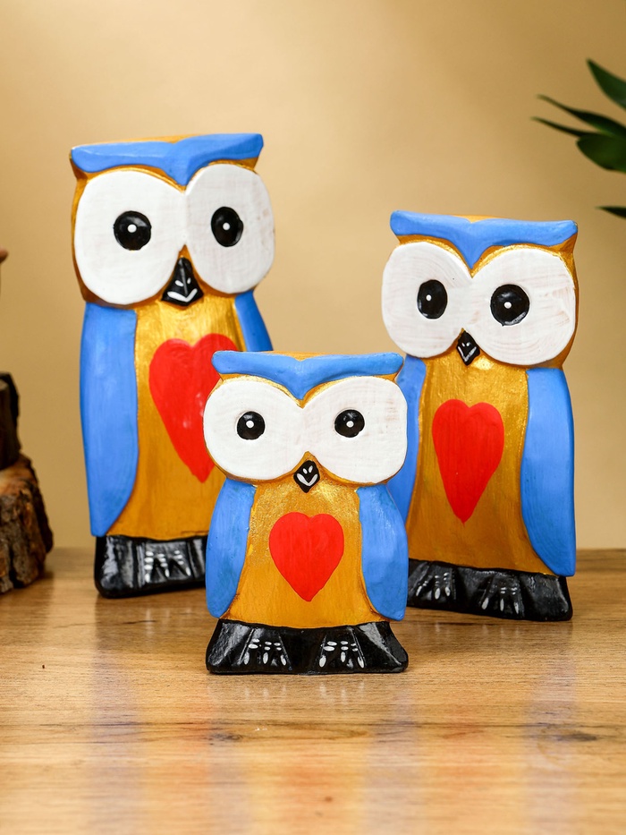 Набор сувенирный "Совята с сердечком" дерево H 15, 13, 11 см, цв. голубой с золотом