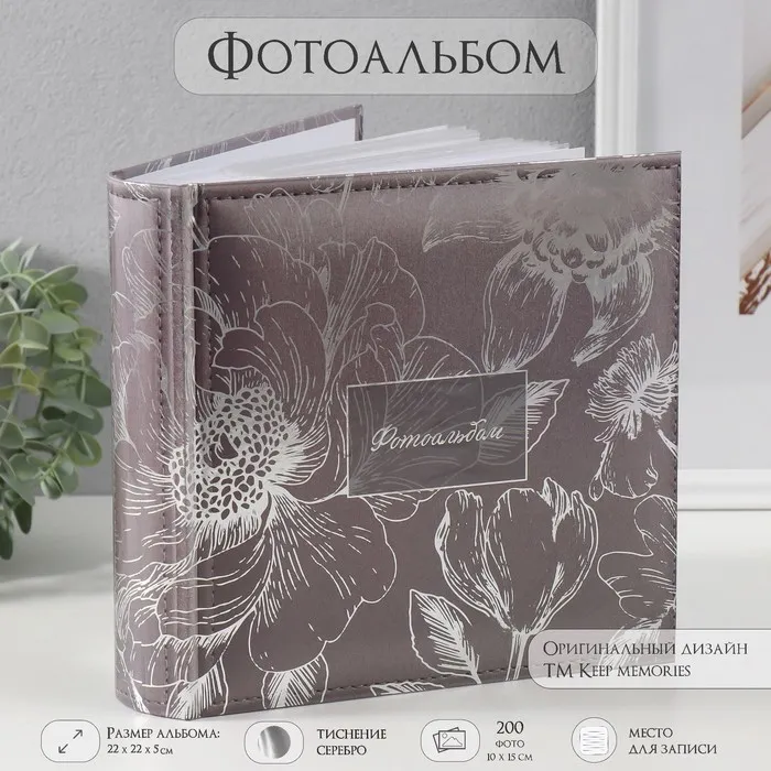 Фотоальбом на 200 фото 10х15 см "Цветы. Серебро" тиснение, бумажн листы 22,4х20,8х5 см 10