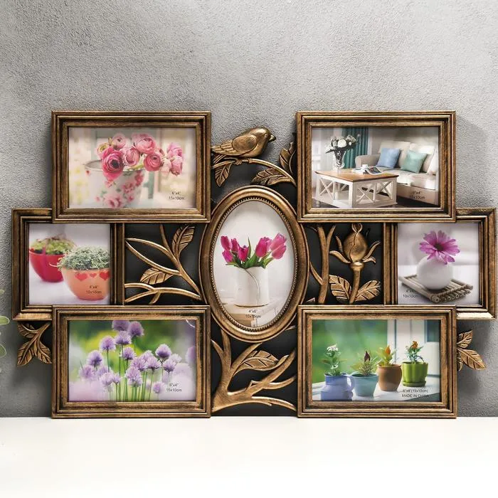 Фоторамка пластик на 7 фото 10х10, 10х15 см "Птица и шиповник" золото 33,5х52 см