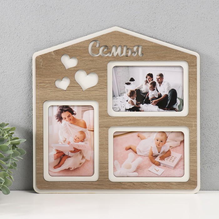 Фоторамка ЛХДФ "Семья домик" 33х33 на 3 фото 10x15 см, цв. дуб/белый (пластиковый экран)