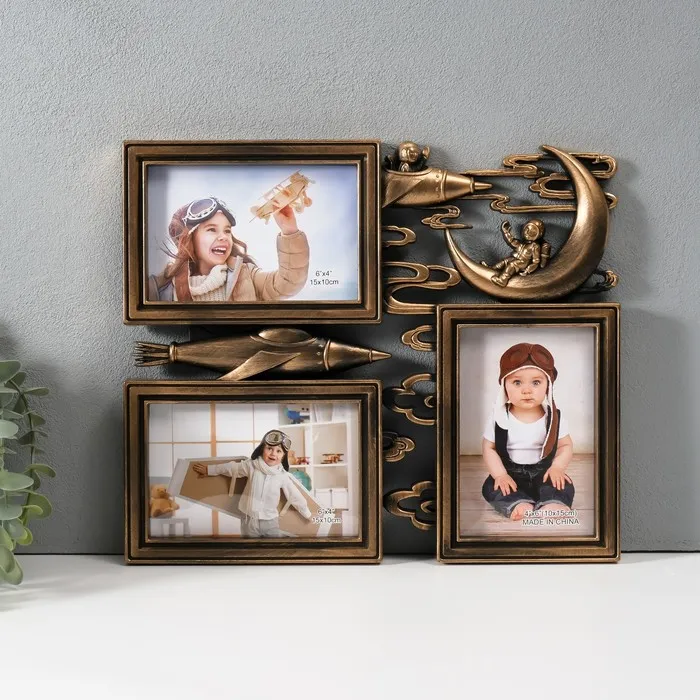 Фоторамка пластик на 3 фото 10х15 см "Космонавт на луне" тёмное золото 1,5х32,8х28 см