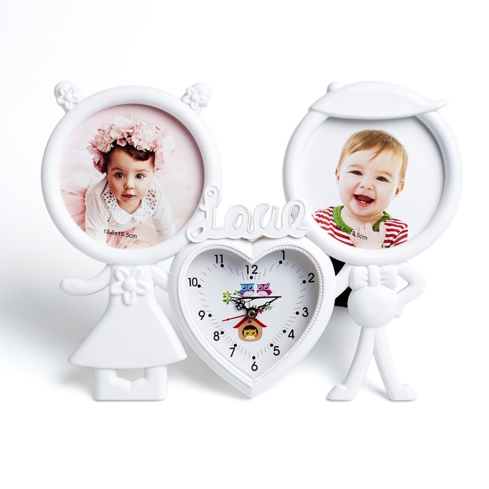 Фоторамка - коллаж на 2 фото d=13.5 см с настольными часами d=13 см, плавный ход, надпись Love, 33×25 см