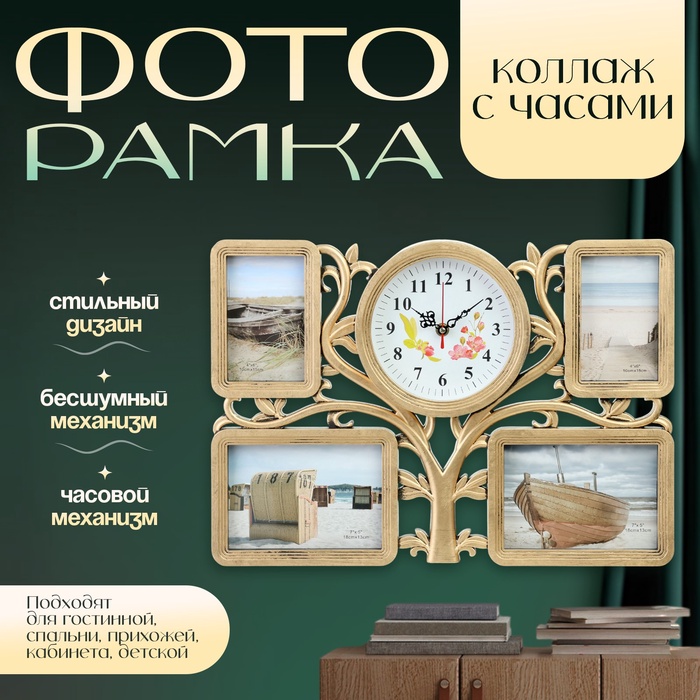 Фоторамка - коллаж с часами настенными «Семейное», бесшумные, 33×48 см, d-18 см