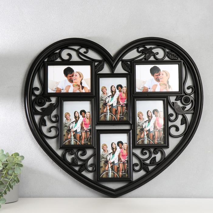 Фоторамка - коллаж на 6 фото 10×15 см «Сердце ажурное», пластик, чёрная, 56×51 см