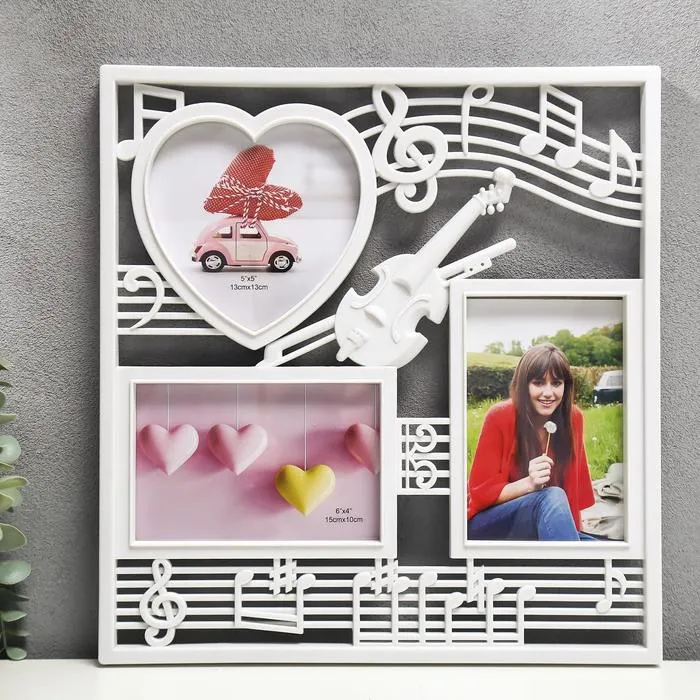 Фоторамка-коллаж на 3 фото 10×15, 13×12 см «Скрипка и ноты», пластик, мультирамка, белый, 34×32 см