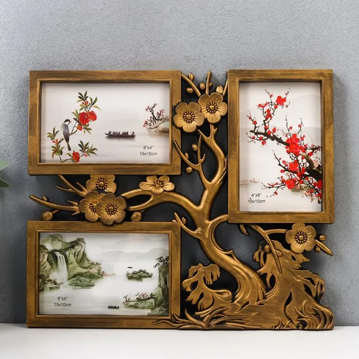 Фоторамка пластик на 3 фото 10х15 см "Вишнёвый сад" тёмное золото 32х27 см