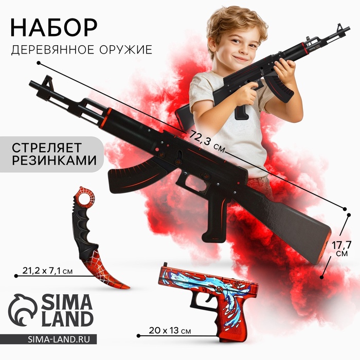 Деревянное оружие, детское сувенирное «Красный и Чёрный», автомат, пистолет, керамбит, набор 3 шт