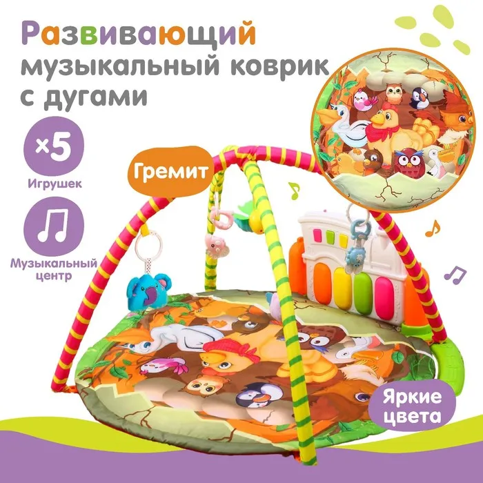 Развивающий музыкальный коврик «Птицы», пианино, 5 игрушек, размер 85х85 см