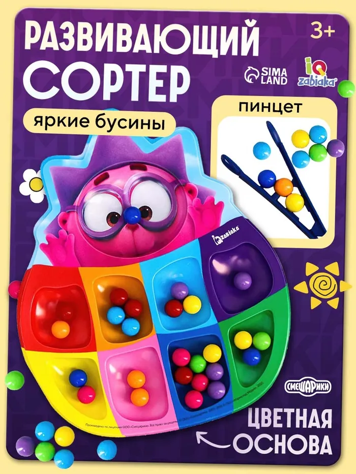 Сортер «Смешарики: Весёлые бусинки», 8 цветов, с пинцетом, по методике Монтессори