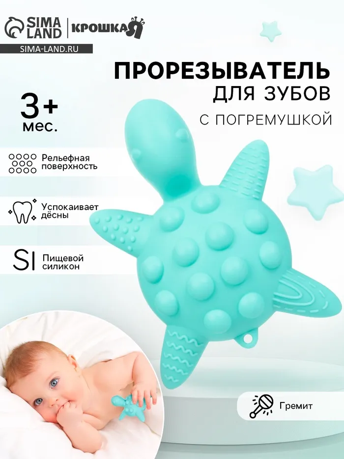 Прорезыватель силиконовый для зубов с погремушкой Крошка Я «Черепаха», 11х7,5см, бирюзовый