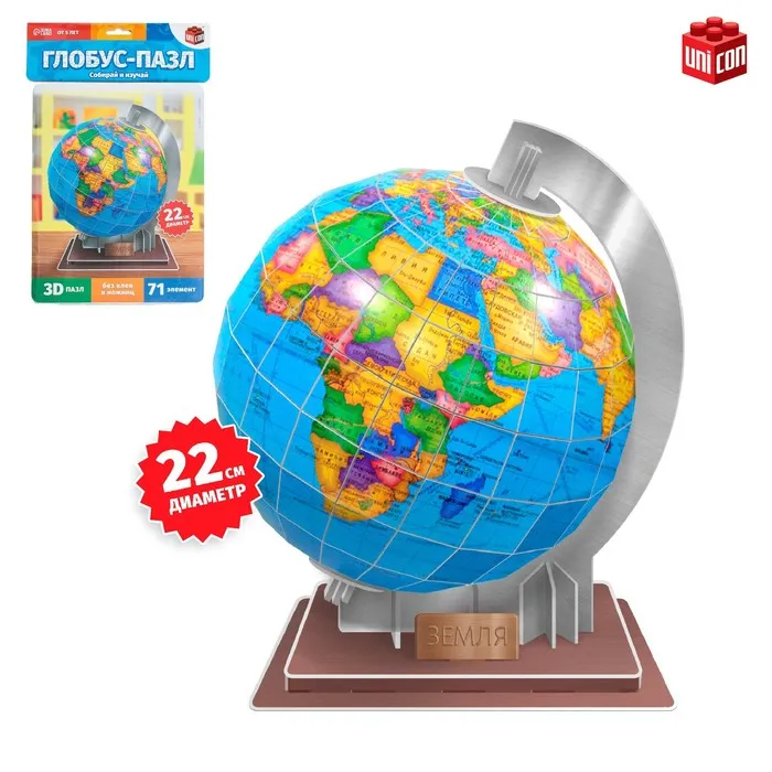Конструктор пазл «Глобус», 3D модель, диаметр 22 см, 71 элемент
