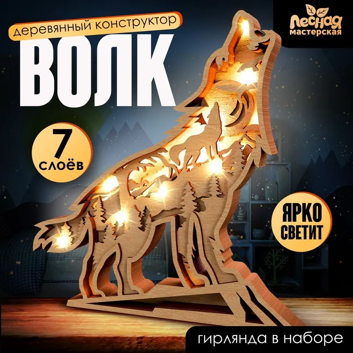 Деревянный конструктор «Волк», размер 21×20 см, гирлянда в комплекте