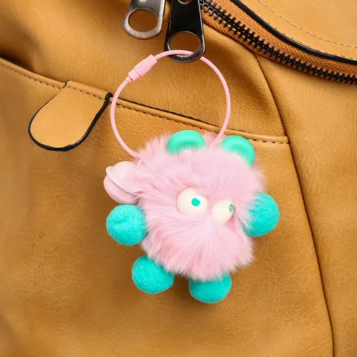 Пушистик на троссе с бубенчиком "Чудик с зелёными ушками" нежно-розовый 8 см