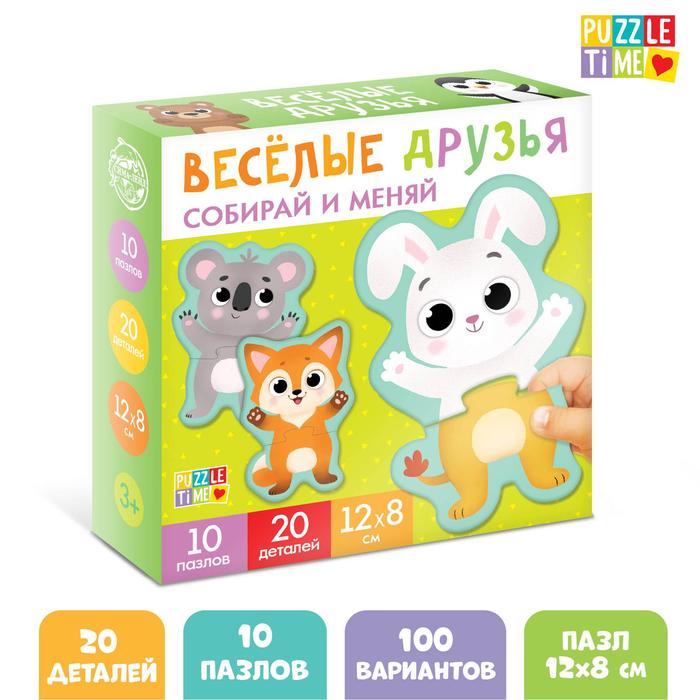 Пазлы 2 в 1 «Весёлые зверята», 100 вариантов, 10 пазлов, 20 деталей