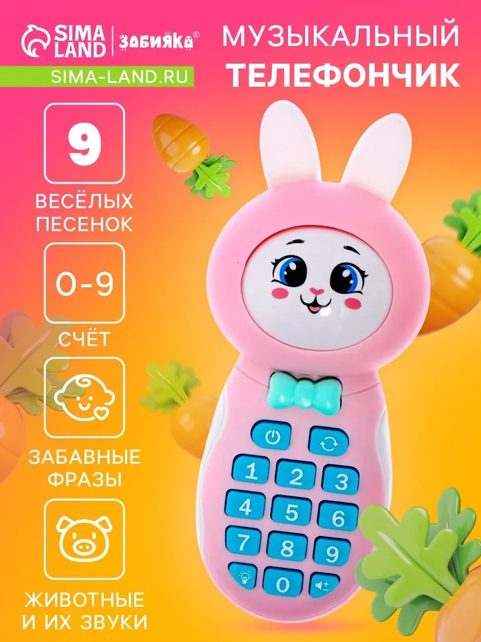 Музыкальный телефон детский «Милый зайка», звук, свет, цвет розовый