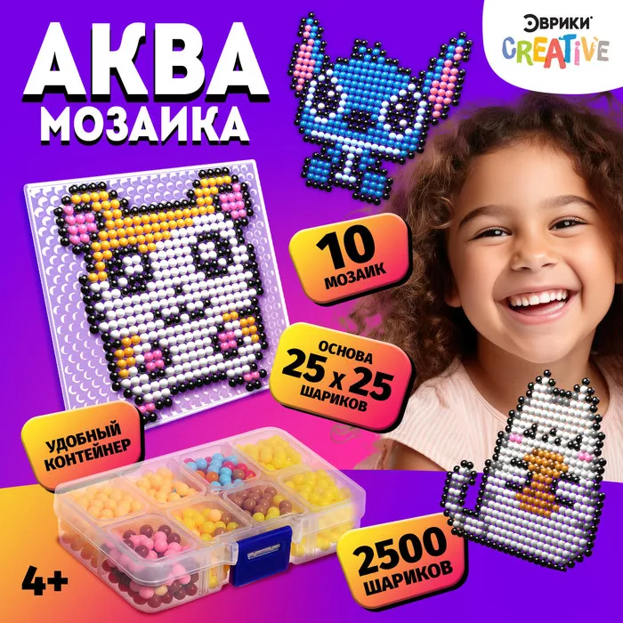 Аквамозаика в контейнере, 2500 шариков, 10 трафаретов, 2 основы