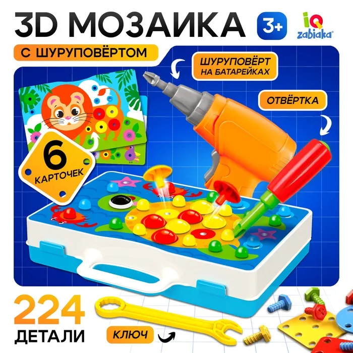 Мозаика - 3D винтовая «Весёлые зверята», в чемоданчике, 6 картинок, с шуруповёртом на батарейках, 3+