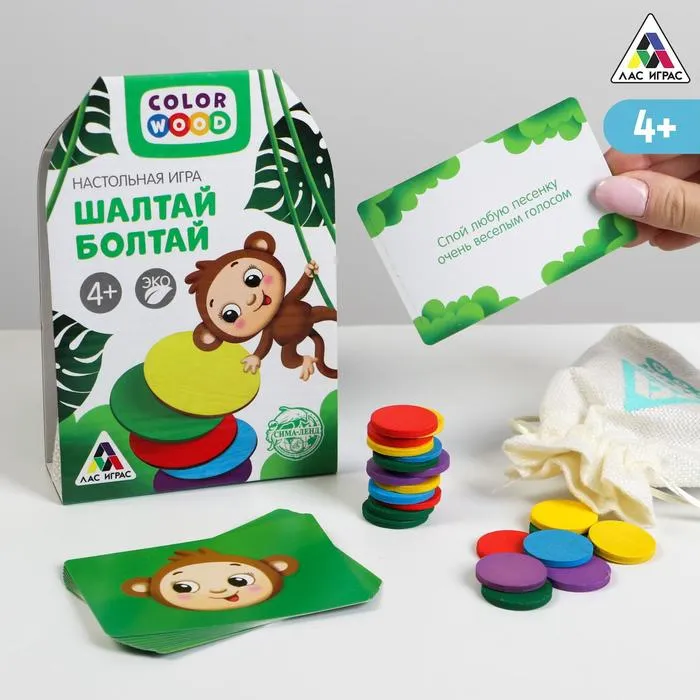Настольная игра «Шалтай-болтай», 50 деревянных фишек, 10 карт, мешок для хранения, 4+
