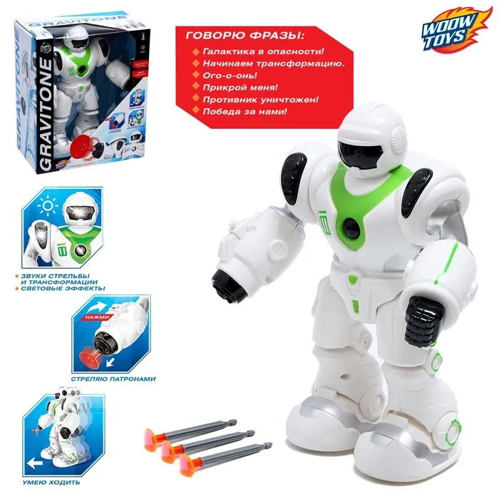 Робот GRAVITONE, свет, звук, стреляет, на батарейках, русская озвучка, зелёный
