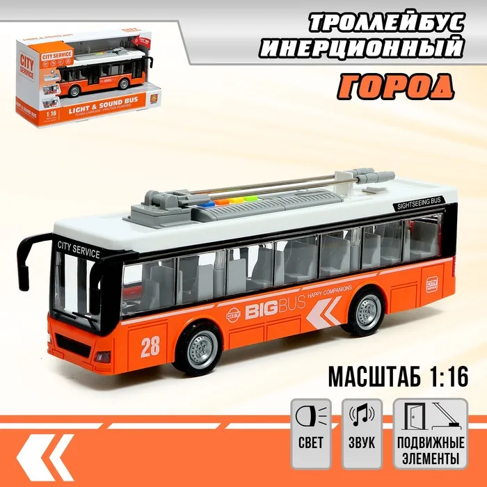 Троллейбус инерционный «Город», 1:16, свет и звук, открываются двери, цвет оранжевый