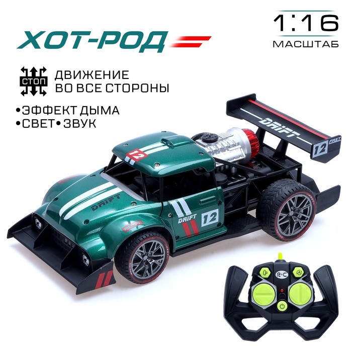 Машинка на пульте управления «Хот-род», радиоуправление, эффект дыма, свет и звук, работает от аккумулятора, цвет зелёный