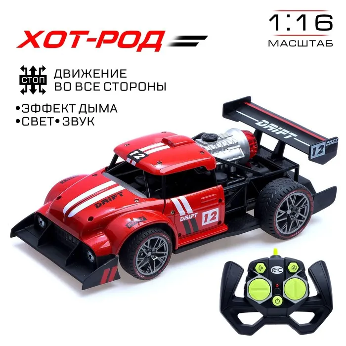 Машина радиоуправляемая «Хот-род», эффект дыма, свет и звук, работает от аккумулятора, цвет красный