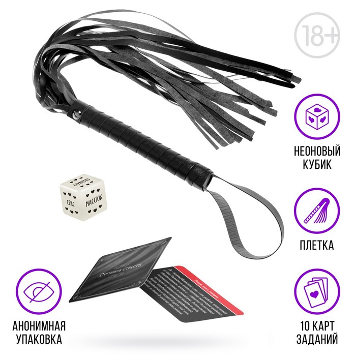 Плётка и кубик в секс игре для пар «50 оттенков страсти», 3 в 1 (10 карт, плётка (цвет микс), 1 неоновый кубик), 18+