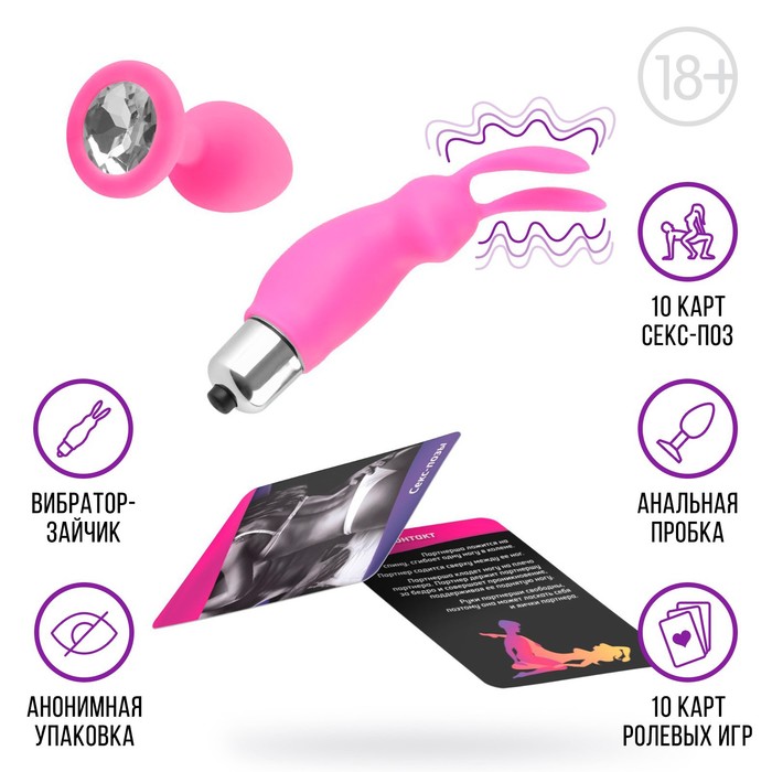 Секс-игра для двоих «Ахи вздохи», 3 в 1 (20 карт, анальная пробка, вибратор-зайчик), 18+